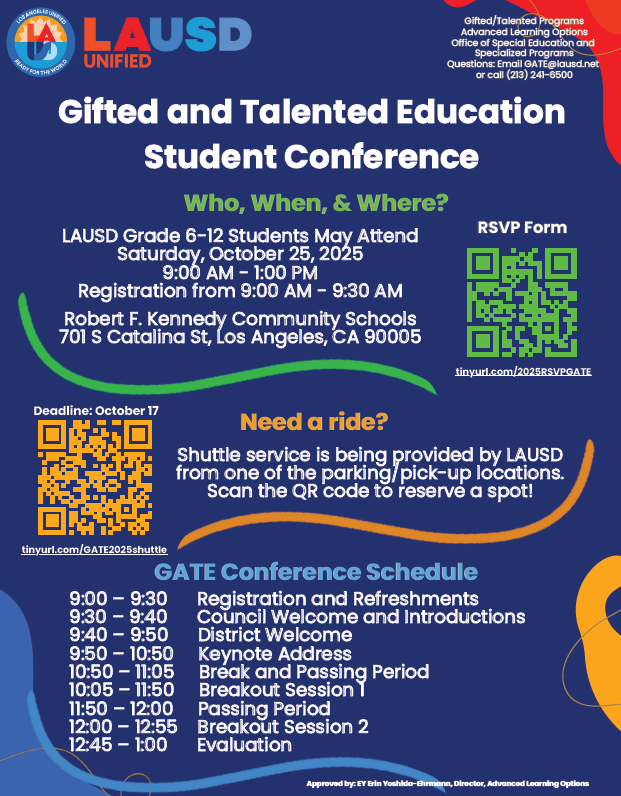 Click on the link above to access the Gifted and Talented Student Conference, October 25, 2025 9:00-1:00 pm.